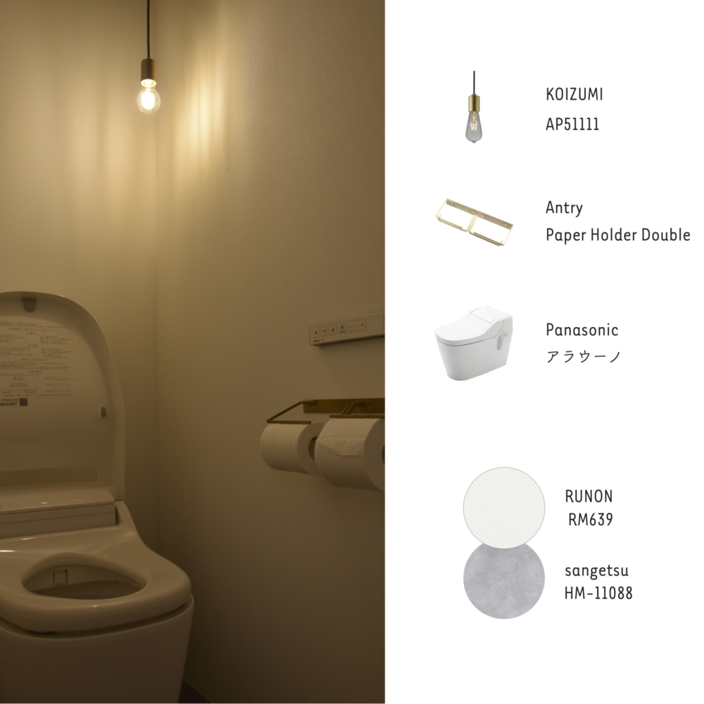 真鍮のペンダントライトとペーパーホルダーの素材感を揃えることで、統一感のある洗練された印象に仕上げています。